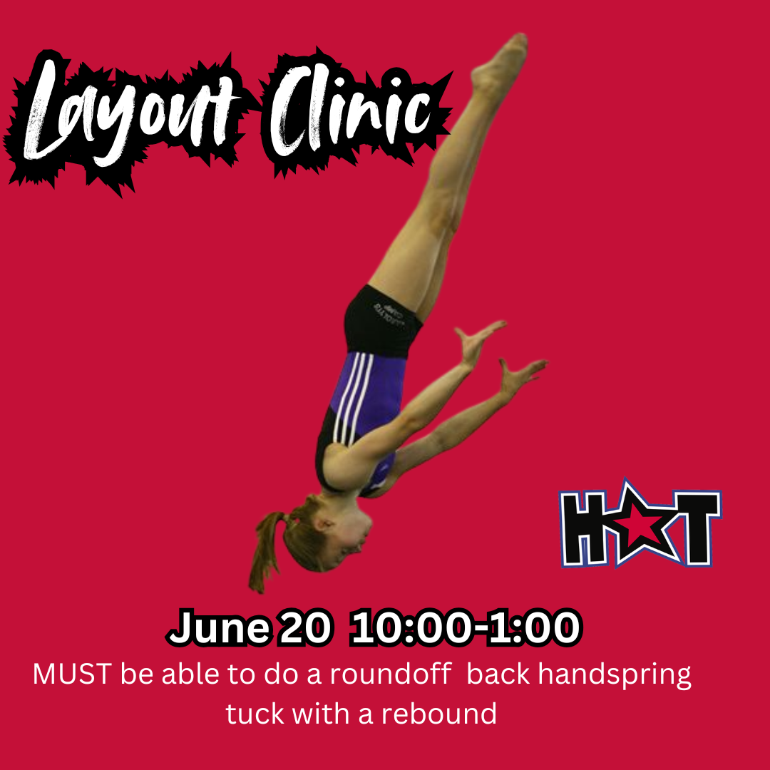 Layout Tumbling Clinic June 20 | 10:00 AM – 1:00 PM Ready to level up? This clinic focuses on developing a strong, clean layout with proper technique, body control, and...