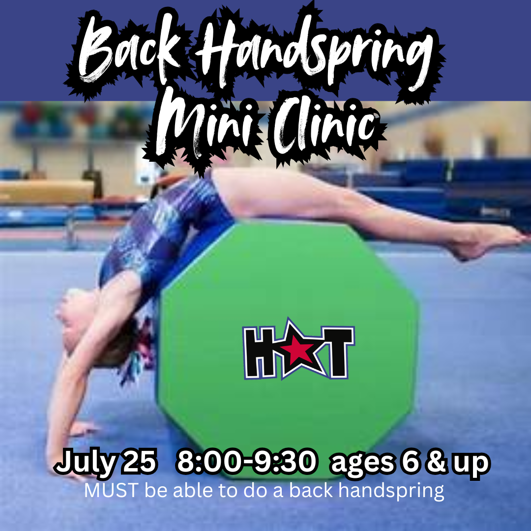 Back Walkover Clinic July 11 8:00 – 9:30 AM Designed for athletes who already have a back walkover and want to improve technique, control, and consistency. Athletes will focus on body positions, flexibility, and timing (using counts) to clean up and strengthen their skill.